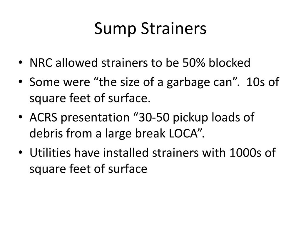 Sump Strainers • NRC allowed strainers to be 50% blocked • Some were “the size of a garbage can”. 10s of square feet of surface. • ACRS presentation “30-50 pickup loads of debris from a large break LOCA”. • Utilities have installed strainers with 1000s of square feet of surface