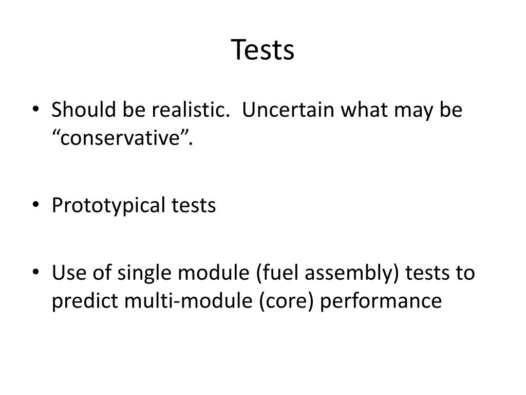 Tests • Should be realistic. Uncertain what may be “conservative”. • Prototypical tests • Use of single module (fuel assembly) tests to predict multi-module (core) performance