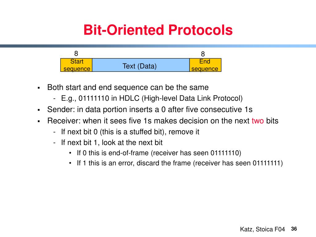 Bit-Oriented Protocols 8 8 Start sequence End sequence • Both start and end sequence can be the same • E.g., 01111110 in HDLC (High-level Data Link Protocol) • Sender: in data portion inserts a 0 after five consecutive 1s • Receiver: when it sees five 1s makes decision on the next two bits • If next bit 0 (this is a stuffed bit), remove it • If next bit 1, look at the next bit • If 0 this is end-of-frame (receiver has seen 01111110) • If 1 this is an error, discard the frame (receiver has seen 01111111) Text (Data)