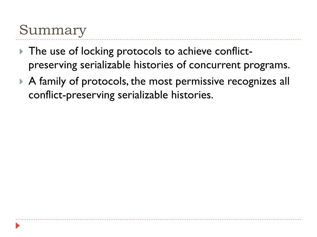 Summary • The use of locking protocols to achieve conflict-preservingserializable histories of concurrent programs. • A family of protocols, the most permissive recognizes all conflict-preserving serializable histories.