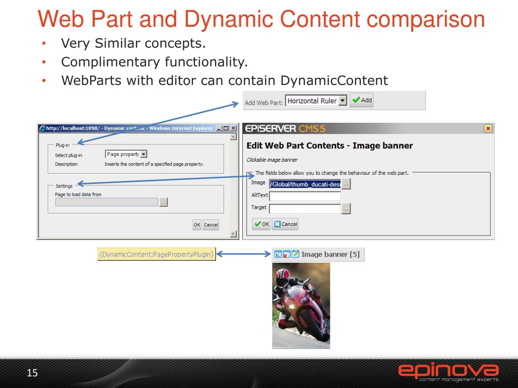 Web Part and Dynamic Content comparison • Very Similar concepts. • Complimentary functionality. • WebParts with editor can contain DynamicContent