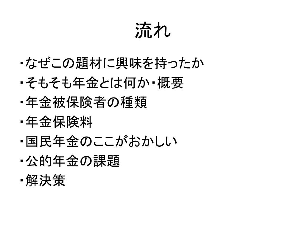 流れ ・なぜこの題材に興味を持ったか ・そもそも年金とは何か・概要 ・年金被保険者の種類 ・年金保険料 ・国民年金のここがおかしい ・公的年金の課題 ・解決策