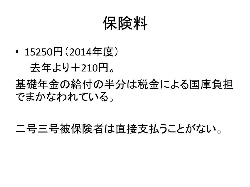 保険料 • 15250円(2014年度) 去年より+210円。 基礎年金の給付の半分は税金による国庫負担でまかなわれている。 二号三号被保険者は直接支払うことがない。