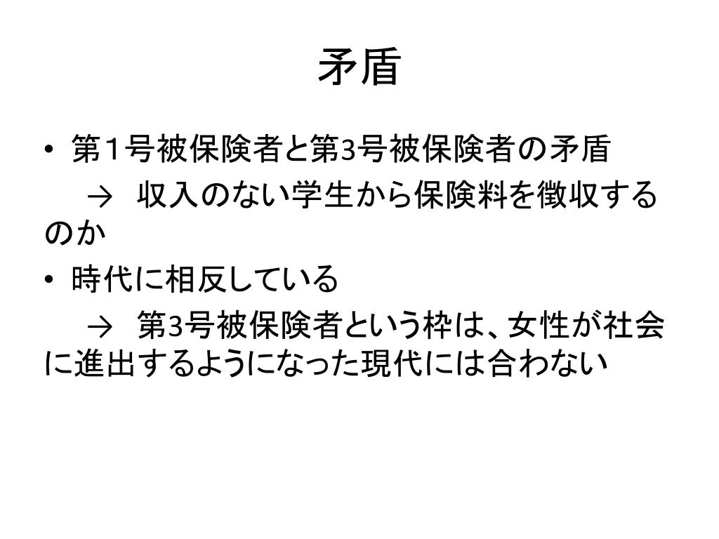 矛盾 • 第1号被保険者と第3号被保険者の矛盾 →収入のない学生から保険料を徴収するのか • 時代に相反している → 第3号被保険者という枠は、女性が社会に進出するようになった現代には合わない