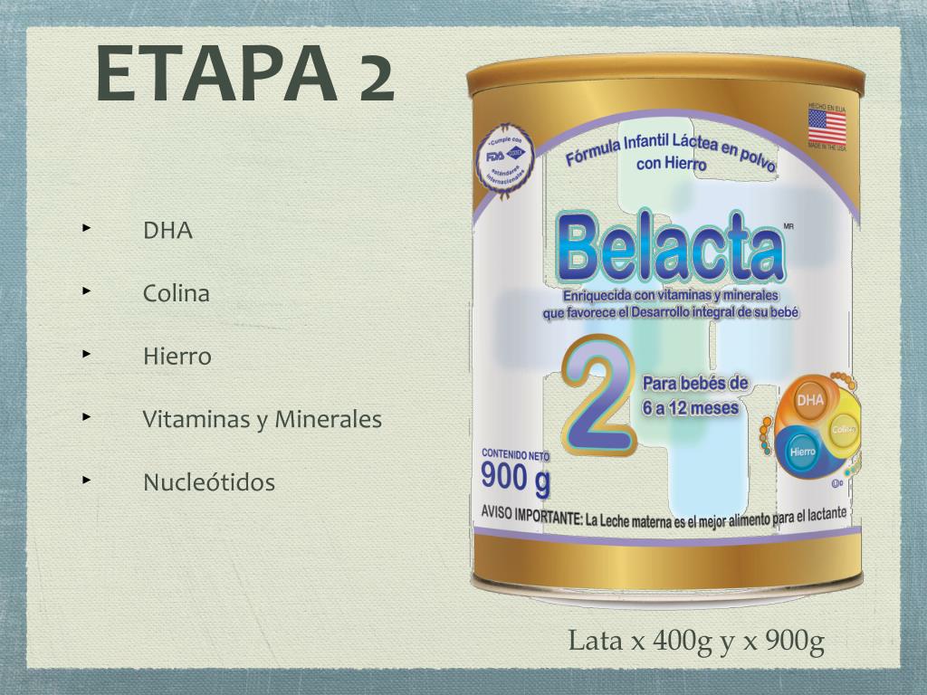 BELACTA. TIPOS DE FÓRMULAS LÁCTEAS. Fórmulas de inicio ETAPA 1 Fórmulas de continuación ETAPA 2 Fórmulas de crecimiento ETAPA 3. Para niños menores de 6 meses. Son semejantes a la leche materna.