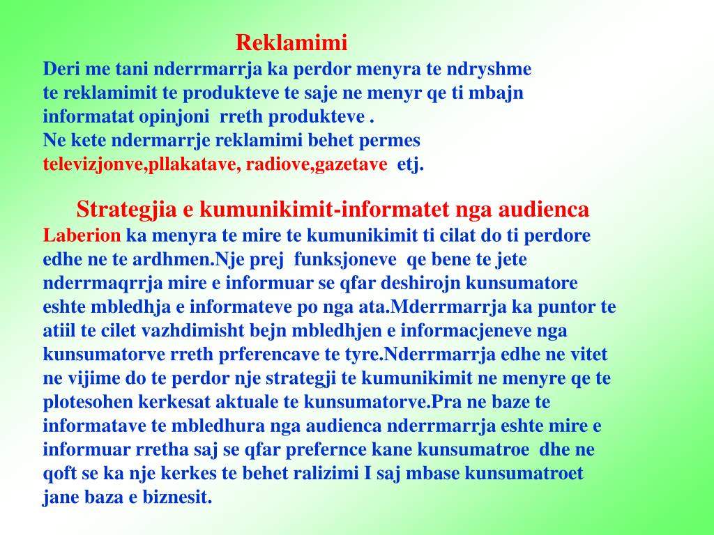 Reklamimi Deri me taninderrmarrja ka perdormenyra te ndryshme te reklamimit te produkteve te saje ne menyrqe ti mbajninformatatopinjonirrethprodukteve . Ne ketendermarrjereklamimibehet permes televizjonve,pllakatave, radiove,gazetaveetj. Strategjia e kumunikimit-informatetngaaudienca Laberionka menyrate mire tekumunikimitticilat do tiperdoreedhe ne teardhmen.Njeprejfunksjoneveqebenetejetenderrmaqrrja mire e informuar se qfardeshirojnkunsumatoreeshtembledhja e informatevepongaata.Mderrmarrja ka puntorteatiilteciletvazhdimishtbejnmbledhjen e informacjenevengakunsumatorverrethprferencavetetyre.Nderrmarrjaedhe ne vitet ne vijime do teperdornjestrategjitekumunikimit ne menyreqeteplotesohenkerkesataktualetekunsumatorve.Pra ne bazeteinformatavetembledhurangaaudiencanderrmarrjaeshte mire e informuarrrethasaj se qfarpreferncekanekunsumatroedhe ne qoft se ka njekerkestebehetralizimi I sajmbasekunsumatroetjanebaza e biznesit.