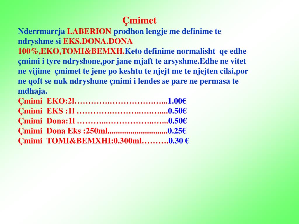 Çmimet NderrmarrjaLABERION prodhonlengje me definime te ndryshme si EKS.DONA.DONA100%,EKO,TOMI&BEMXH.Ketodefinimenormalishtqeedheçmimi i tyrendryshone,porjanemjaft te arsyshme.Edhe ne vitet ne vijimeçmimet te jene po keshtu te njejt me te njejtencilsi,por ne qoft se nukndryshuneçmimi i lendes se pare ne permasa te mdhaja. Çmimi EKO:2l………….…………….…...1.00€ Çmimi EKS :1l ………….………..….…....0.50€ Çmimi Dona:1l ………...……………..…...0.50€ Çmimi Dona Eks :250ml.............................0.25€ Çmimi TOMI&BEMXHI:0.300ml……….0.30 €