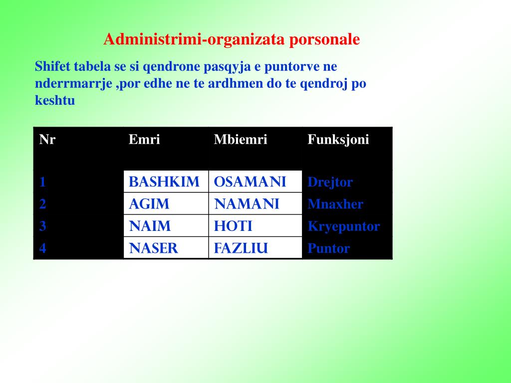 Administrimi-organizataporsonale Shifettabela se siqendronepasqyja e puntorve ne nderrmarrje,poredhe ne teardhmen do teqendrojpokeshtu