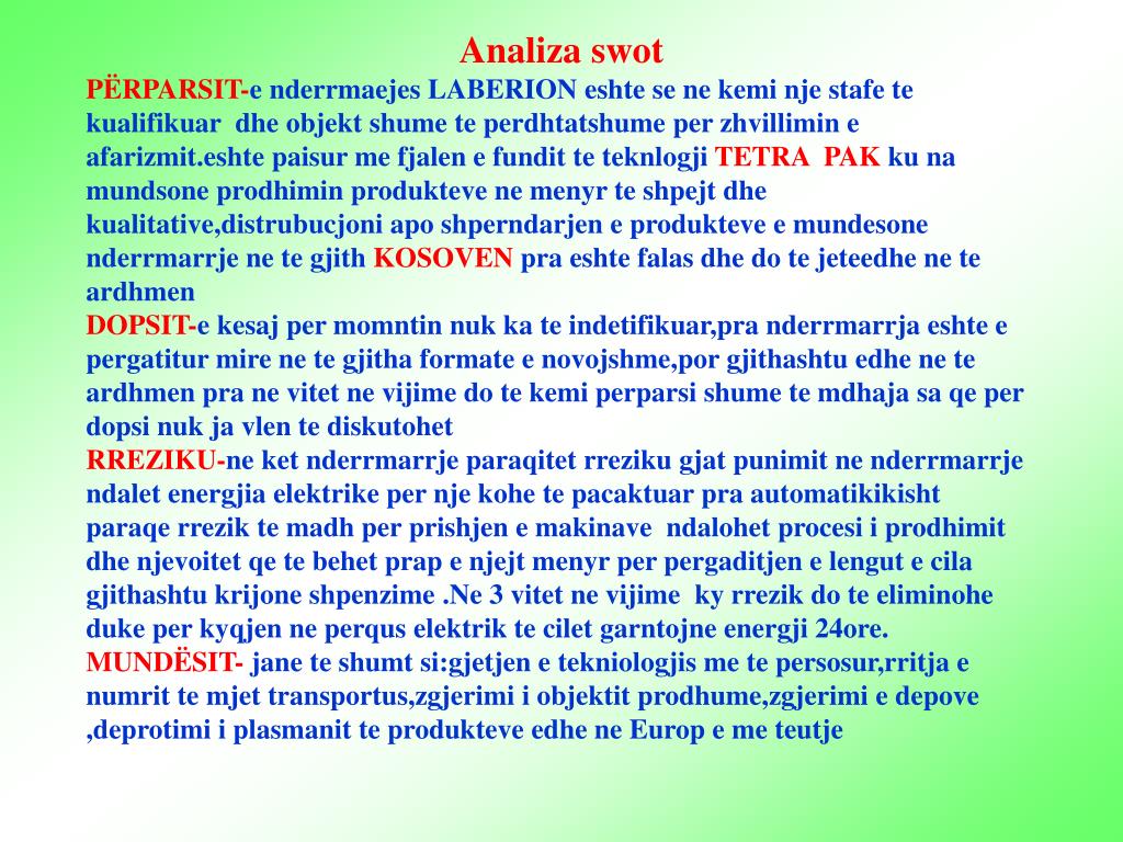 Analizaswot PËRPARSIT-e nderrmaejes LABERION eshte se ne keminjestafe te kualifikuardheobjektshume te perdhtatshume per zhvillimin e afarizmit.eshtepaisur me fjalen e fundit te teknlogjiTETRA PAK ku na mundsoneprodhiminprodukteve ne menyr te shpejtdhekualitative,distrubucjoniaposhperndarjen e produkteve e mundesonenderrmarrje ne te gjithKOSOVENpraeshtefalasdhe do te jeteedhe ne te ardhmen DOPSIT-e kesaj per momntinnuk ka te indetifikuar,pranderrmarrjaeshte e pergatitur mire ne te gjitha formate e novojshme,porgjithashtuedhe ne te ardhmenpra ne vitet ne vijime do te kemiperparsishume te mdhaja sa qe per dopsinukjavlen te diskutohet RREZIKU-ne ket nderrmarrjeparaqitetrrezikugjatpunimit ne nderrmarrjendaletenergjiaelektrike per njekohe te pacaktuarpraautomatikikishtparaqerrezik te madh per prishjen e makinavendalohetprocesi i prodhimitdhenjevoitetqe te behetprap e njejtmenyr per pergaditjen e lengut e cilagjithashtukrijoneshpenzime .Ne 3 vitet ne vijimekyrrezik do te eliminoheduke per kyqjen ne perquselektrik te ciletgarntojneenergji 24ore. MUNDËSIT- jane te shumtsi:gjetjen e tekniologjis me te persosur,rritja e numrit te mjettransportus,zgjerimi i objektitprodhume,zgjerimi e depove ,deprotimi i plasmanit te produkteveedhe ne Europ e me teutje