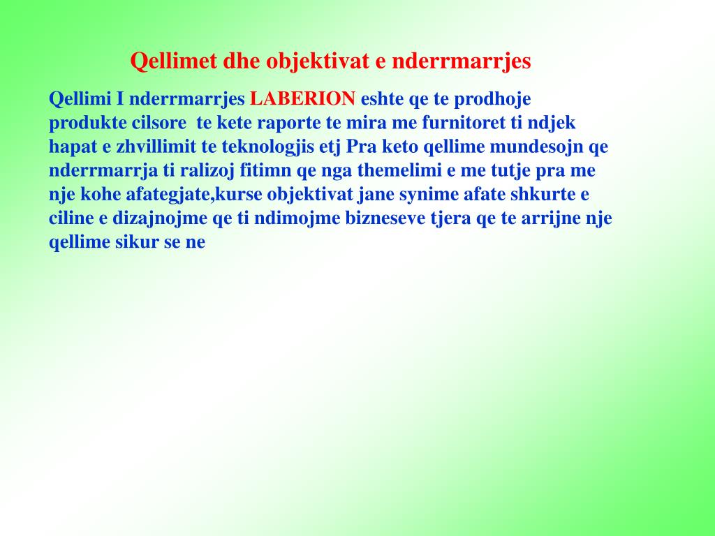 Qellimetdheobjektivat e nderrmarrjes Qellimi I nderrmarrjesLABERION eshteqeteprodhojeproduktecilsoreteketeraportetemira me furnitorettindjekhapat e zhvillimitteteknologjisetjPraketoqellimemundesojnqenderrmarrjatiralizojfitimnqengathemelimi e me tutjepra me njekoheafategjate,kurseobjektivatjanesynimeafateshkurte e ciline e dizajnojmeqetindimojmebiznesevetjeraqetearrijnenjeqellimesikur se ne
