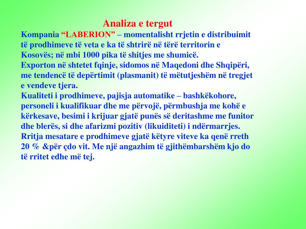 Analiza e tergut Kompania“LABERION” – momentalishtrrjetin e distribuimittëprodhimevetëveta e ka tështrirënëtërëterritorin e Kosovës; nëmbi 1000 pikatëshitjes me shumicë. Exportonnështetetfqinje, sidomosnëMaqedonidheShqipëri, me tendencëtëdepërtimit (plasmanit) tëmëtutjeshëmnëtregjet e vendevetjera. Kualitetiiprodhimeve, pajisjaautomatike – bashkëkohore, personeliikualifikuardhe me përvojë, përmbushja me kohë e kërkesave, besimiikrijuargjatëpunëssëderitashme me funitordheblerës, sidheafarizmipozitiv (likuiditeti) indërmarrjes. Rritjamesatare e prodhimevegjatëkëtyreviteve ka qenërreth 20 % &përçdovit. Me njëangazhimtëgjithëmbarshëmkjo do tërritetedhemëtej.