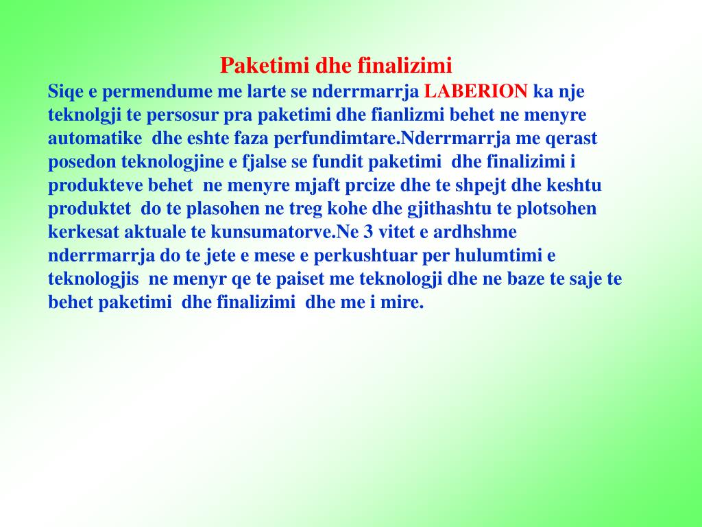 Paketimidhefinalizimi Siqe e permendume me larte se nderrmarrjaLABERION ka njeteknolgji te persosurprapaketimidhefianlizmibehet ne menyreautomatikedheeshtefazaperfundimtare.Nderrmarrja me qerastposedonteknologjine e fjalse se funditpaketimidhefinalizimi i produktevebehet ne menyremjaftprcizedhe te shpejtdhekeshtuproduktet do te plasohen ne tregkohedhegjithashtu te plotsohenkerkesataktuale te kunsumatorve.Ne 3 vitet e ardhshmenderrmarrja do te jete e mese e perkushtuar per hulumtimi e teknologjis ne menyrqe te paiset me teknologjidhe ne baze te saje te behetpaketimidhefinalizimidhe me i mire.