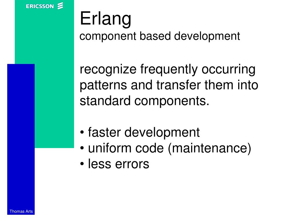 Thomas Arts Erlangcomponent based development • recognize frequently occurring • patterns and transfer them into • standard components. • faster development • uniform code (maintenance) • less errors
