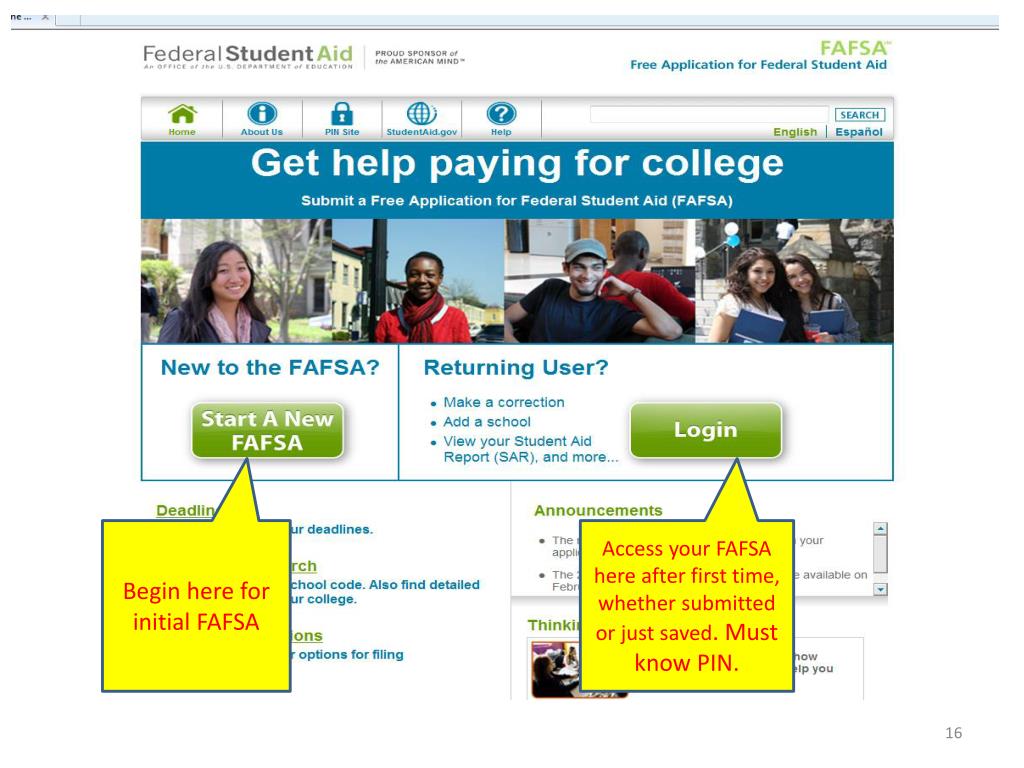 Begin here for initial FAFSA Access your FAFSA here after first time, whether submitted or just saved. Must know PIN.