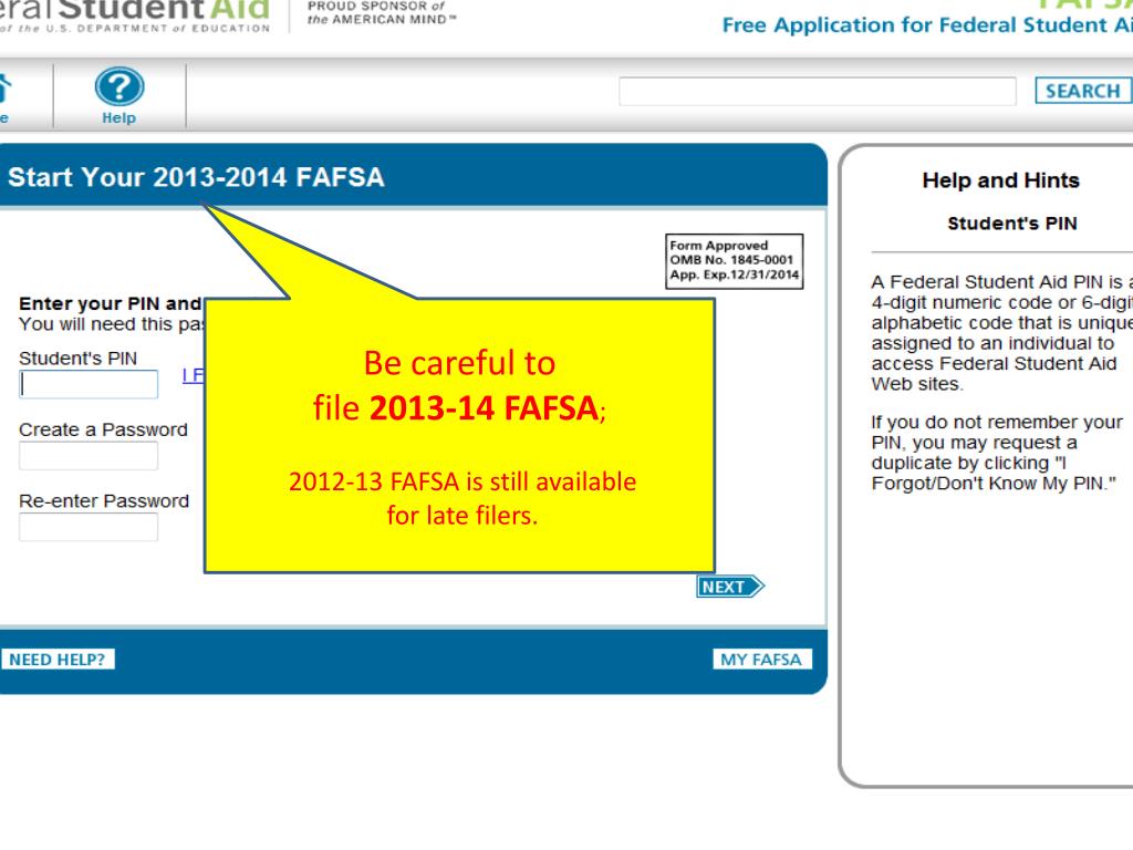 Be careful to file 2013-14 FAFSA; 2012-13 FAFSA is still available for late filers.