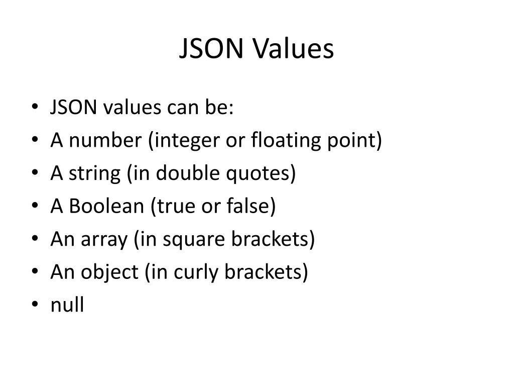 JSON Values • JSON values can be: • A number (integer or floating point) • A string (in double quotes) • A Boolean (true or false) • An array (in square brackets) • An object (in curly brackets) • null
