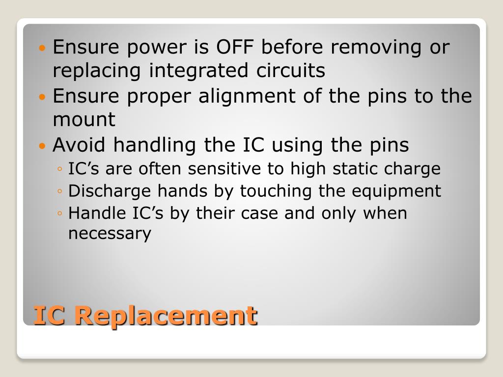Ensure power is OFF before removing or replacing integrated circuits • Ensure proper alignment of the pins to the mount • Avoid handling the IC using the pins • IC’s are often sensitive to high static charge • Discharge hands by touching the equipment • Handle IC’s by their case and only when necessary IC Replacement