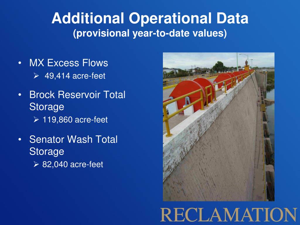 Additional Operational Data(provisional year-to-date values) • MX Excess Flows • 49,414 acre-feet • Brock Reservoir Total Storage • 119,860 acre-feet • Senator Wash Total Storage • 82,040 acre-feet