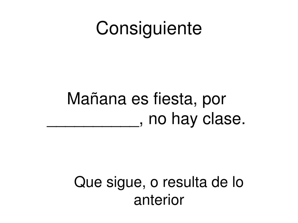 Consiguiente Mañana es fiesta, por __________, no hay clase. Que sigue, o resulta de lo anterior