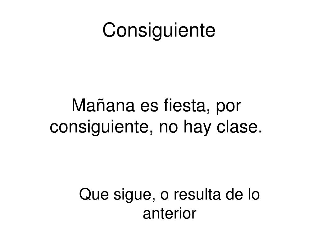 Consiguiente Mañana es fiesta, por consiguiente, no hay clase. Que sigue, o resulta de lo anterior