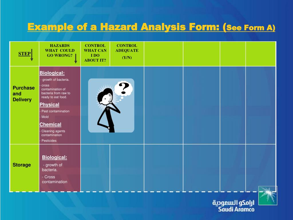 Example of a Hazard Analysis Form: (See Form A) Biological: - growth of bacteria. - cross contamination of bacteria from raw to ready to eat food. Physical - Pest contamination - Mold Chemical - Cleaning agents contamination - Pesticides