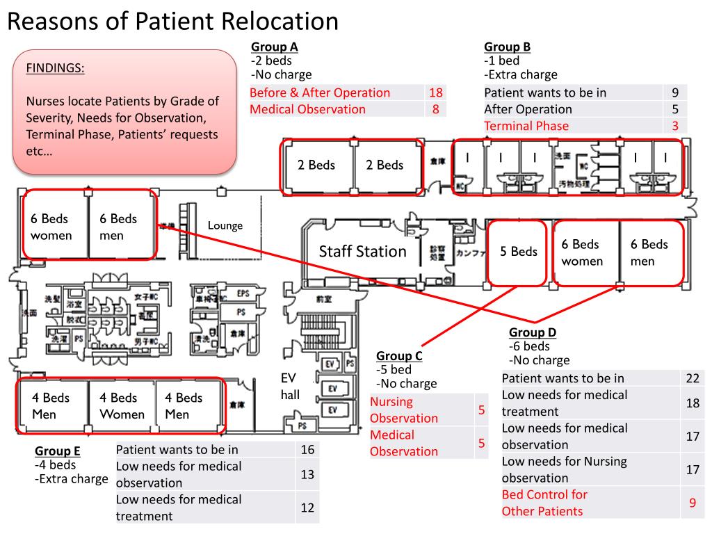 Reasons of Patient Relocation Group A -2 beds -No charge Group B -1 bed -Extra charge FINDINGS: Nurses locate Patients by Grade of Severity, Needs for Observation, Terminal Phase, Patients’ requests etc… 1 1 1 1 1 2 Beds 2 Beds 6 Beds women 6 Beds men Lounge 6 Beds women 6 Beds men Staff Station 5 Beds Group D -6 beds -No charge EV hall Group C -5 bed -No charge 4 Beds Men 4 Beds Women 4 Beds Men Group E -4 beds -Extra charge
