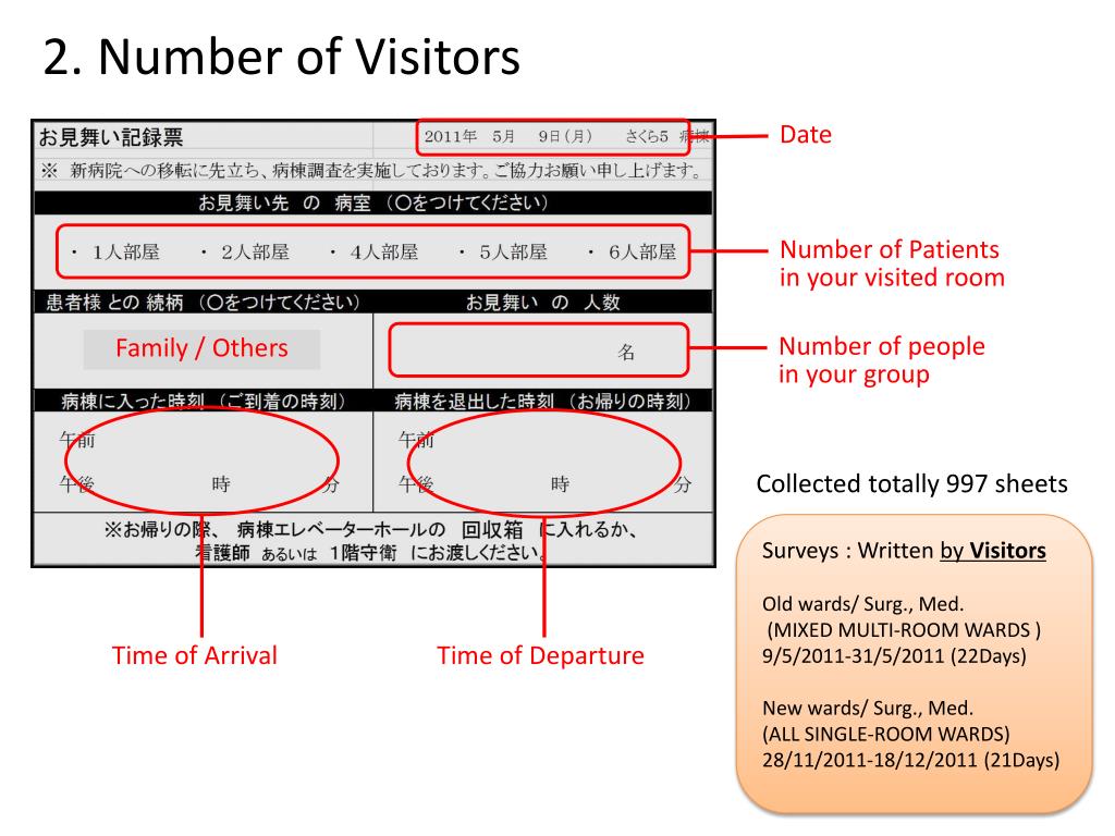 2. Number of Visitors Date Number of Patients in your visited room Number of people in your group Family / Others Collected totally 997sheets Surveys : Written by Visitors Old wards/ Surg., Med. (MIXED MULTI-ROOM WARDS ) 9/5/2011-31/5/2011(22Days) New wards/ Surg., Med. (ALL SINGLE-ROOM WARDS) 28/11/2011-18/12/2011(21Days) Time of Departure Time of Arrival