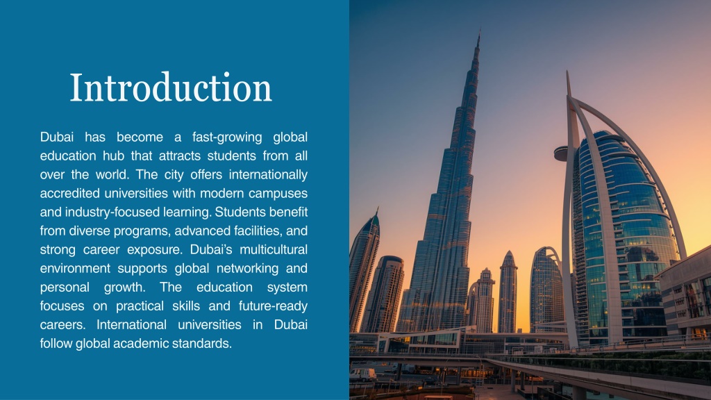 2. Introduction • Dubai has become a fast-growing global education hub that attracts students from all over the world. The city offers internationally accredited universities with modern campuses and industry-focused learning. Students benefit from diverse programs, advanced facilities, and strong career exposure. Dubai’s multicultural environment supports global networking and personal growth. The education system focuses on practical skills and future-ready careers. International universities in Dubai follow global academic standards.