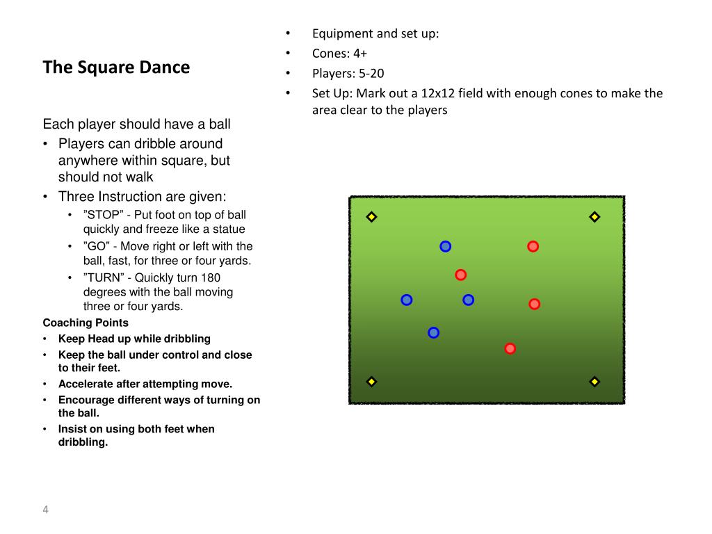 The Square Dance • Equipment and set up: • Cones: 4+ • Players: 5-20 • Set Up: Mark out a 12x12 field with enough cones to make the area clear to the players Each player should have a ball Players can dribble around anywhere within square, but should not walk Three Instruction are given: ”STOP” - Put foot on top of ball quickly and freeze like a statue ”GO” - Move right or left with the ball, fast, for three or four yards. ”TURN” - Quickly turn 180 degrees with the ball moving three or four yards. Coaching Points Keep Head up while dribbling Keep the ball under control and close to their feet. Accelerate after attempting move. Encourage different ways of turning on the ball. Insist on using both feet when dribbling.