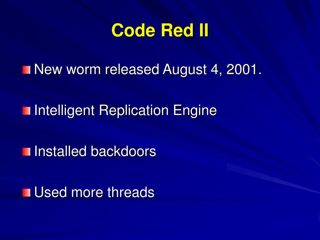 Code Red II • New worm released August 4, 2001. • Intelligent Replication Engine • Installed backdoors • Used more threads