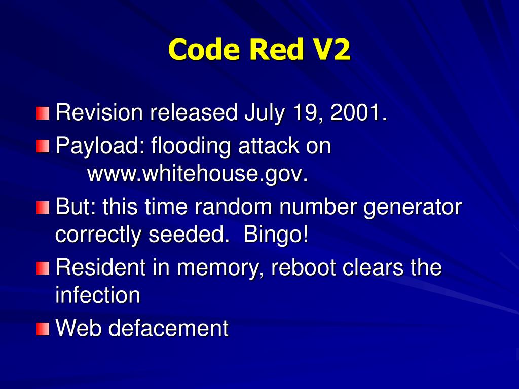 Code Red V2 • Revision released July 19, 2001. • Payload: flooding attack onwww.whitehouse.gov. • But: this time random number generator correctly seeded. Bingo! • Resident in memory, reboot clears the infection • Web defacement