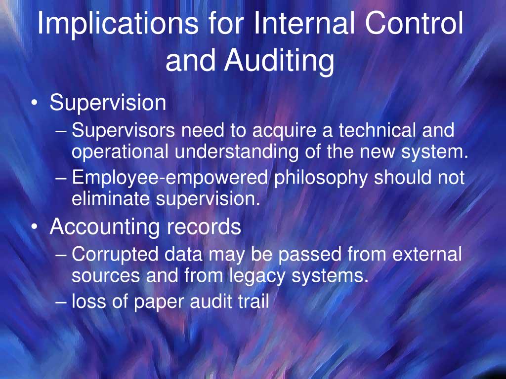 Implications for Internal Control and Auditing • Supervision • Supervisors need to acquire a technical and operational understanding of the new system. • Employee-empowered philosophy should not eliminate supervision. • Accounting records • Corrupted data may be passed from external sources and from legacy systems. • loss of paper audit trail