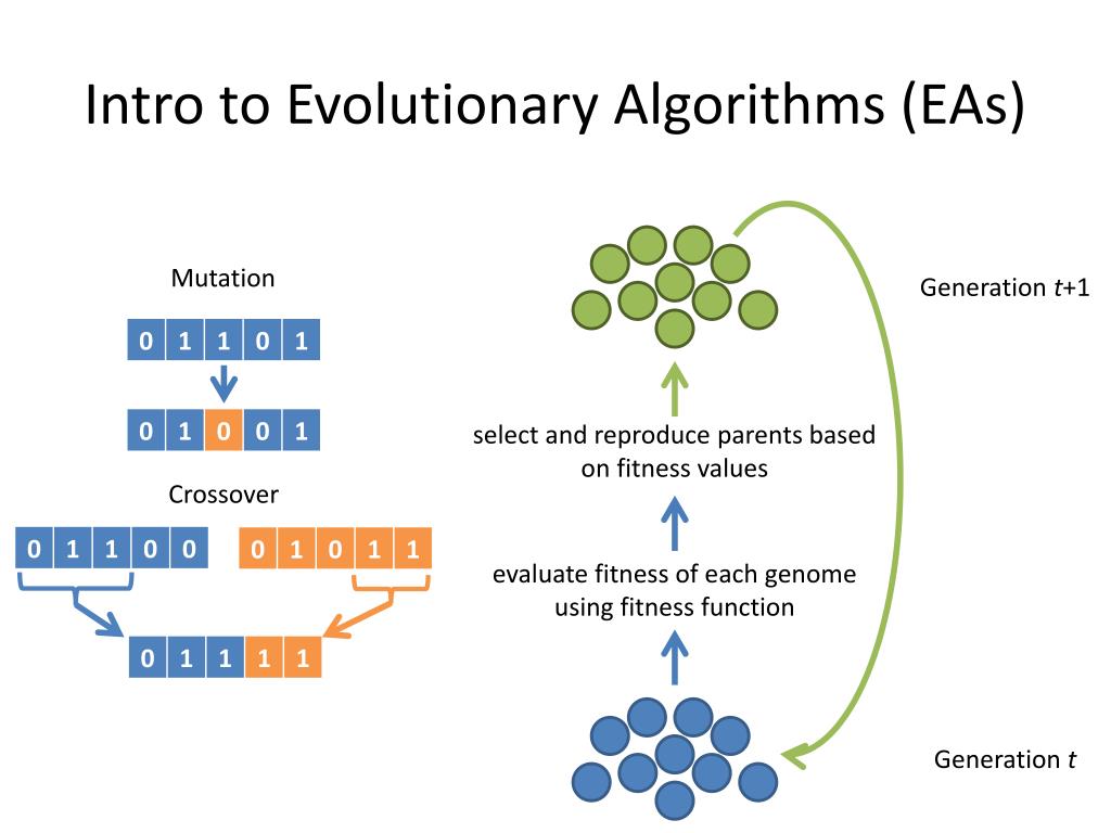 Intro to Evolutionary Algorithms (EAs) Mutation Generation t+1 select and reproduce parents based on fitness values Crossover evaluate fitness of each genome using fitness function Generation t