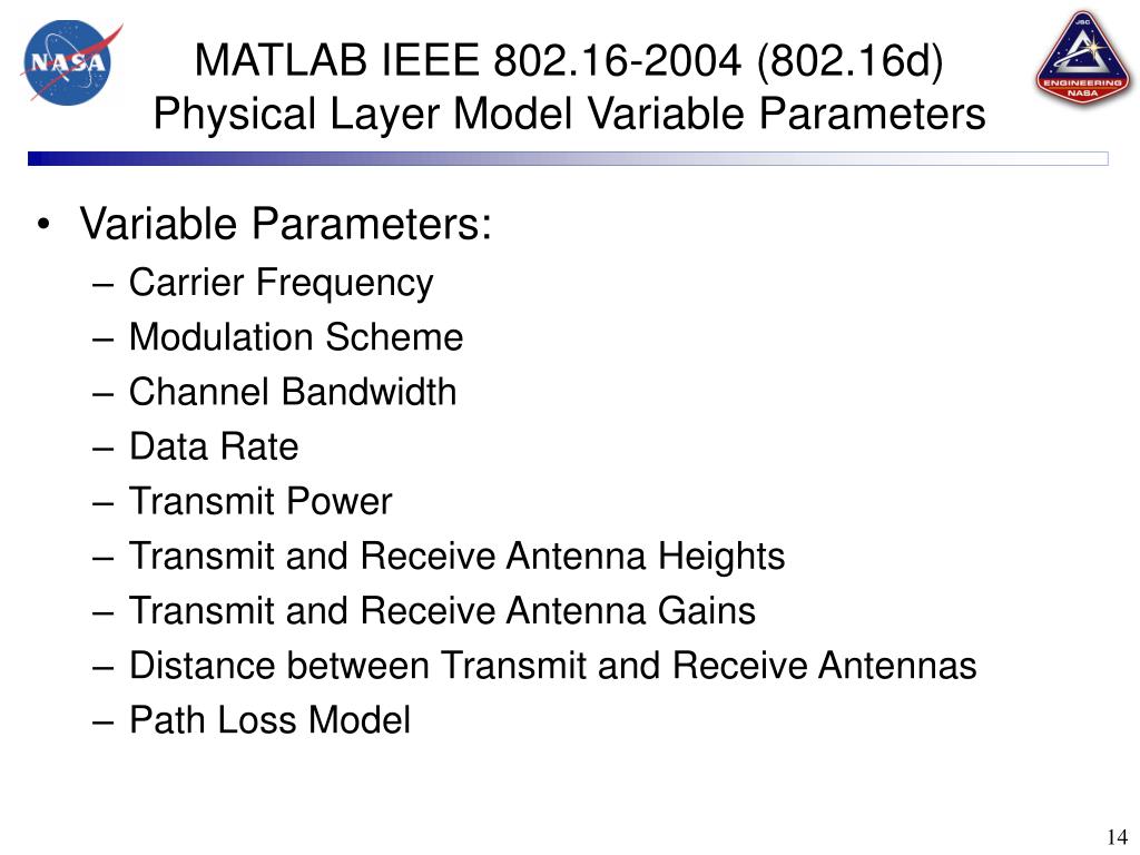 MATLAB IEEE 802.16-2004 (802.16d) Physical Layer Model Variable Parameters • Variable Parameters: • Carrier Frequency • Modulation Scheme • Channel Bandwidth • Data Rate • Transmit Power • Transmit and Receive Antenna Heights • Transmit and Receive Antenna Gains • Distance between Transmit and Receive Antennas • Path Loss Model