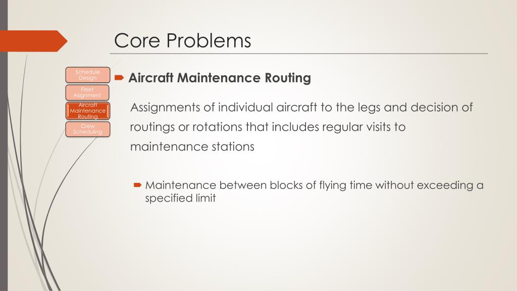 Schedule Design Core Problems • FleetAsignment • Aircraft Maintenance Routing • CrewScheduling • Aircraft Maintenance Routing Assignments of individual aircraft to the legsand decision of routings or rotations that includes regular visits to maintenance stations • Maintenance between blocks of flying time without exceeding a specified limit