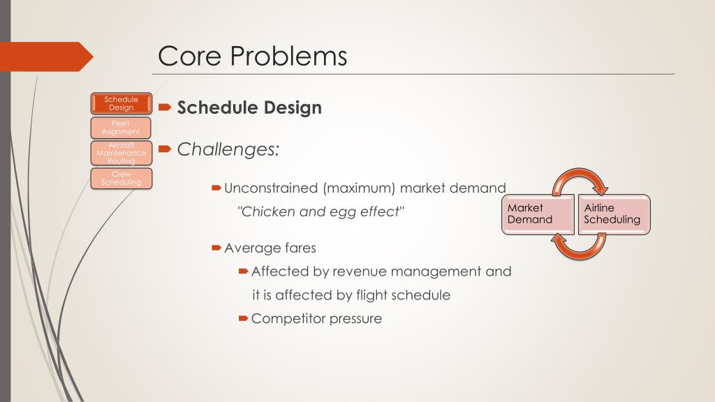 Schedule Design Core Problems • Fleet Asignment • Aircraft Maintenance Routing • Crew Scheduling • Schedule Design • Challenges: • Unconstrained (maximum) market demand "Chicken and egg effect" • Average fares • Affected by revenue management and it is affected by flight schedule • Competitor pressure