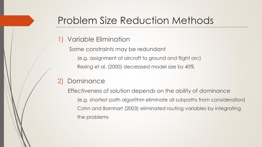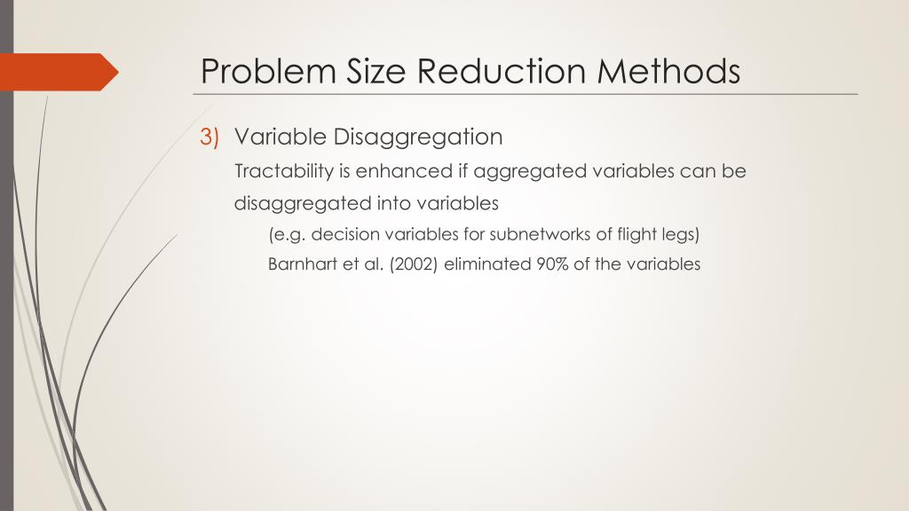 Problem Size Reduction Methods • Variable Disaggregation Tractability is enhanced if aggregated variables can be disaggregated into variables (e.g. decision variables for subnetworks of flight legs) Barnhart et al. (2002) eliminated 90% of the variables
