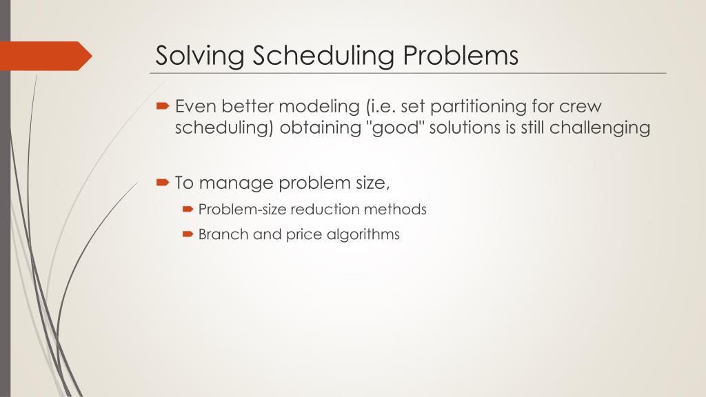 Solving Scheduling Problems • Even better modeling (i.e. set partitioning for crew scheduling) obtaining "good" solutions is still challenging • To manage problem size, • Problem-size reduction methods • Branch and price algorithms