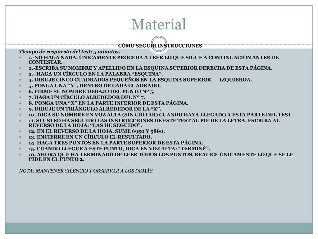 Material CÓMO SEGUIR INSTRUCCIONES Tiempo de respuesta del test: 5 minutos. 1.-NO HAGA NADA. ÚNICAMENTE PROCEDA A LEER LO QUE SIGUE A CONTINUACIÓN ANTES DE CONTESTAR. 2.-ESCRIBA SU NOMBRE Y APELLIDO EN LA ESQUINA SUPERIOR DERECHA DE ESTA PÁGINA. 3.- HAGA UN CÍRCULO EN LA PALABRA “ESQUINA”. 4. DIBUJE CINCO CUADRADOS PEQUEÑOS EN LA ESQUINA SUPERIOR IZQUIERDA. 5. PONGA UNA “X”, DENTRO DE CADA CUADRADO. 6. FIRME SU NOMBRE DEBAJO DEL PUNTO Nº 5. 7. HAGA UN CÍRCULO ALREDEDOR DEL Nº 7. 8. PONGA UNA “X” EN LA PARTE INFERIOR DE ESTA PÁGINA. 9. DIBUJE UN TRIÁNGULO ALREDEDOR DE LA “X”. 10. DIGA SU NOMBRE EN VOZ ALTA (SIN GRITAR) CUANDO HAYA LLEGADO A ESTA PARTE DEL TEST. 11. SI USTED HA SEGUIDO LAS INSTRUCCIONES DE ESTE TEST AL PIE DE LA LETRA, ESCRIBA AL REVERSO DE LA HOJA: “LAS HE SEGUIDO”. 12. EN EL REVERSO DE LA HOJA, SUME 6950 Y 5880. 13. ENCIERRE EN UN CÍRCULO EL RESULTADO. 14. HAGA TRES PUNTOS EN LA PARTE SUPERIOR DE ESTA PÁGINA. 15. CUANDO LLEGUE A ESTE PUNTO, DIGA EN VOZ ALTA: “TERMINÉ”. 16. AHORA QUE HA TERMINADO DE LEER TODOS LOS PUNTOS, REALICE ÚNICAMENTE LO QUE SE LE PIDE EN EL PUNTO 2. NOTA: MANTENER SILENCIO Y OBSERVAR A LOS DEMÁS