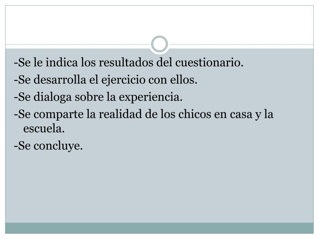 -Se le indica los resultados del cuestionario. -Se desarrolla el ejercicio con ellos. -Se dialoga sobre la experiencia. -Se comparte la realidad de los chicos en casa y la escuela. -Se concluye.