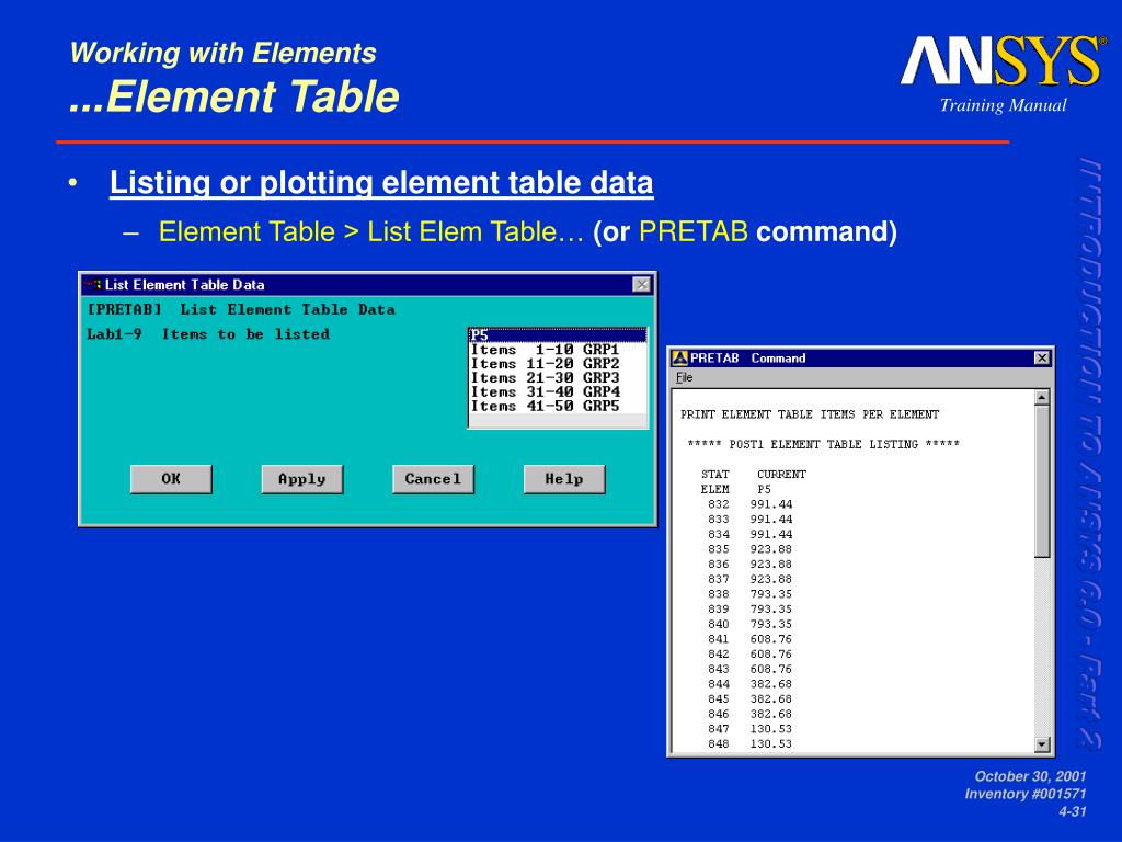 Working with Elements...Element Table • A typical element table session consists of the following steps: • First select the desired elements • Load results data into the table • List or plot the data • Perform desired arithmetic operations • Element table functions are located in the GUI under General Postproc > Element Table. October 30, 2001 Inventory #001571 4-27