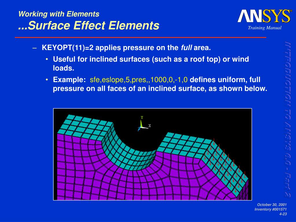 Working with Elements...Surface Effect Elements • KEYOPT(11)=2 applies pressure on the full area. • Useful for inclined surfaces (such as a roof top) or wind loads. • Example: sfe,eslope,5,pres,,1000,0,-1,0 defines uniform, full pressure on all faces of an inclined surface, as shown below. October 30, 2001 Inventory #001571 4-23