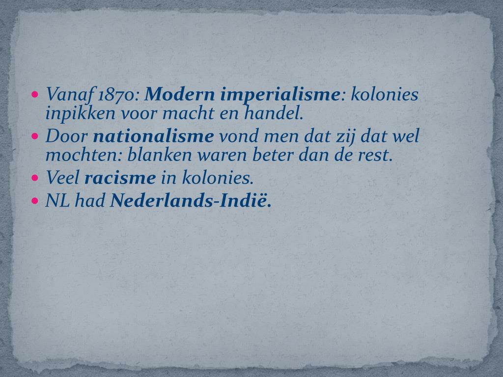 Vanaf 1870: Modern imperialisme: kolonies inpikken voor macht en handel. • Door nationalisme vond men dat zij dat wel mochten: blanken waren beter dan de rest. • Veel racisme in kolonies. • NL had Nederlands-Indië.