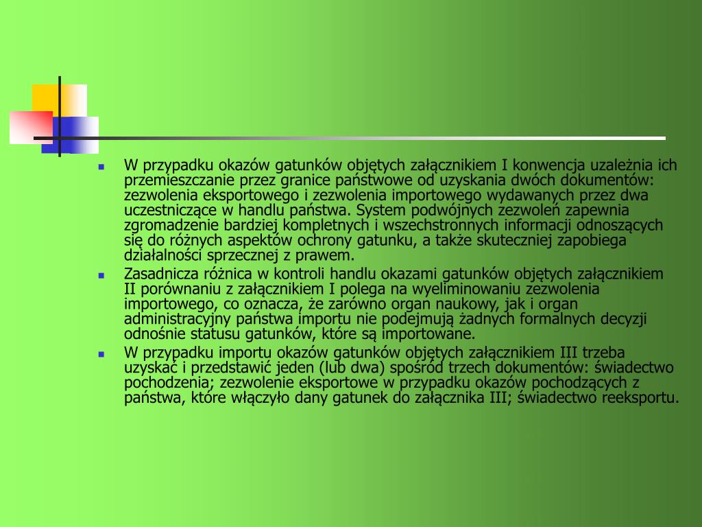 W przypadku okazów gatunków objętych załącznikiem I konwencja uzależnia ich przemieszczanie przez granice państwowe od uzyskania dwóch dokumentów: zezwolenia eksportowego i zezwolenia importowego wydawanych przez dwa uczestniczące w handlu państwa. System podwójnych zezwoleń zapewnia zgromadzenie bardziej kompletnych i wszechstronnych informacji odnoszących się do różnych aspektów ochrony gatunku, a także skuteczniej zapobiega działalności sprzecznej z prawem. • Zasadnicza różnica w kontroli handlu okazami gatunków objętych załącznikiem II porównaniu z załącznikiem I polega na wyeliminowaniu zezwolenia importowego, co oznacza, że zarówno organ naukowy, jak i organ administracyjny państwa importu nie podejmują żadnych formalnych decyzji odnośnie statusu gatunków, które są importowane. • W przypadku importu okazów gatunków objętych załącznikiem III trzeba uzyskać i przedstawić jeden (lub dwa) spośród trzech dokumentów: świadectwo pochodzenia; zezwolenie eksportowe w przypadku okazów pochodzących z państwa, które włączyło dany gatunek do załącznika III; świadectwo reeksportu.