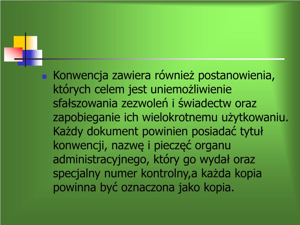 Konwencja zawiera również postanowienia, których celem jest uniemożliwienie sfałszowania zezwoleń i świadectw oraz zapobieganie ich wielokrotnemu użytkowaniu. Każdy dokument powinien posiadać tytuł konwencji, nazwę i pieczęć organu administracyjnego, który go wydał oraz specjalny numer kontrolny,a każda kopia powinna być oznaczona jako kopia.