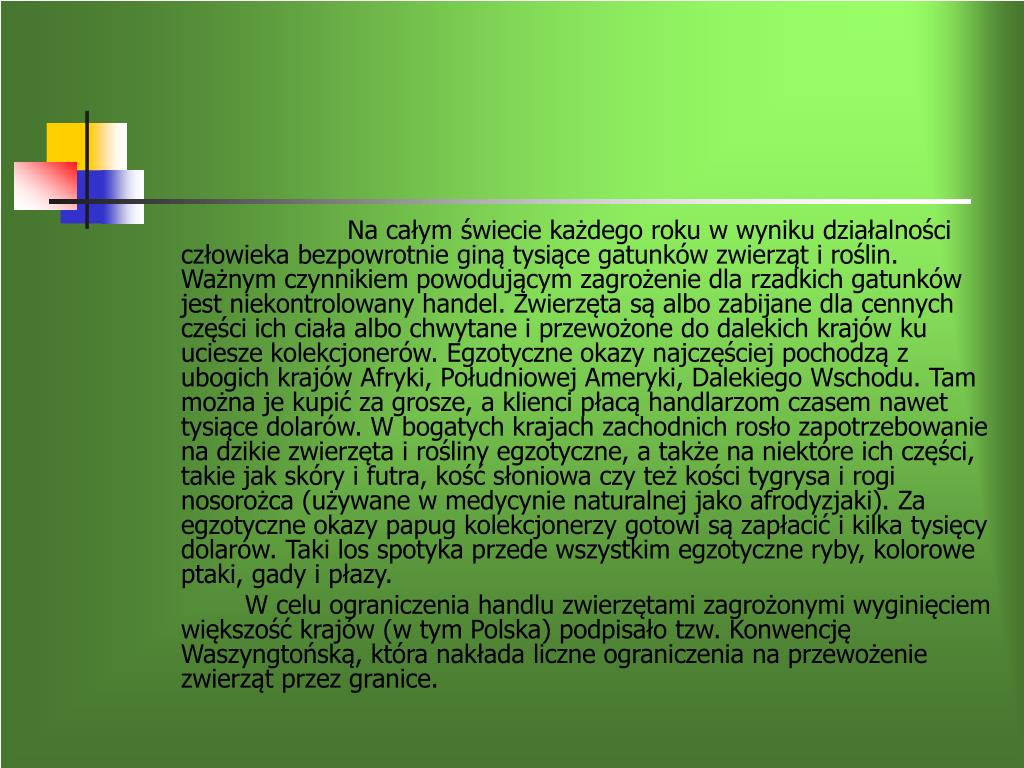Na całym świecie każdego roku w wyniku działalności człowieka bezpowrotnie giną tysiące gatunków zwierząt i roślin. Ważnym czynnikiem powodującym zagrożenie dla rzadkich gatunków jest niekontrolowany handel. Zwierzęta są albo zabijane dla cennych części ich ciała albo chwytane i przewożone do dalekich krajów ku uciesze kolekcjonerów. Egzotyczne okazy najczęściej pochodzą z ubogich krajów Afryki, Południowej Ameryki, Dalekiego Wschodu. Tam można je kupić za grosze, a klienci płacą handlarzom czasem nawet tysiące dolarów. W bogatych krajach zachodnich rosło zapotrzebowanie na dzikie zwierzęta i rośliny egzotyczne, a także na niektóre ich części, takie jak skóry i futra, kość słoniowa czy też kości tygrysa i rogi nosorożca (używane w medycynie naturalnej jako afrodyzjaki). Za egzotyczne okazy papug kolekcjonerzy gotowi są zapłacić i kilka tysięcy dolarów. Taki los spotyka przede wszystkim egzotyczne ryby, kolorowe ptaki, gady i płazy. W celu ograniczenia handlu zwierzętami zagrożonymi wyginięciem większość krajów (w tym Polska) podpisało tzw. Konwencję Waszyngtońską, która nakłada liczne ograniczenia na przewożenie zwierząt przez granice.
