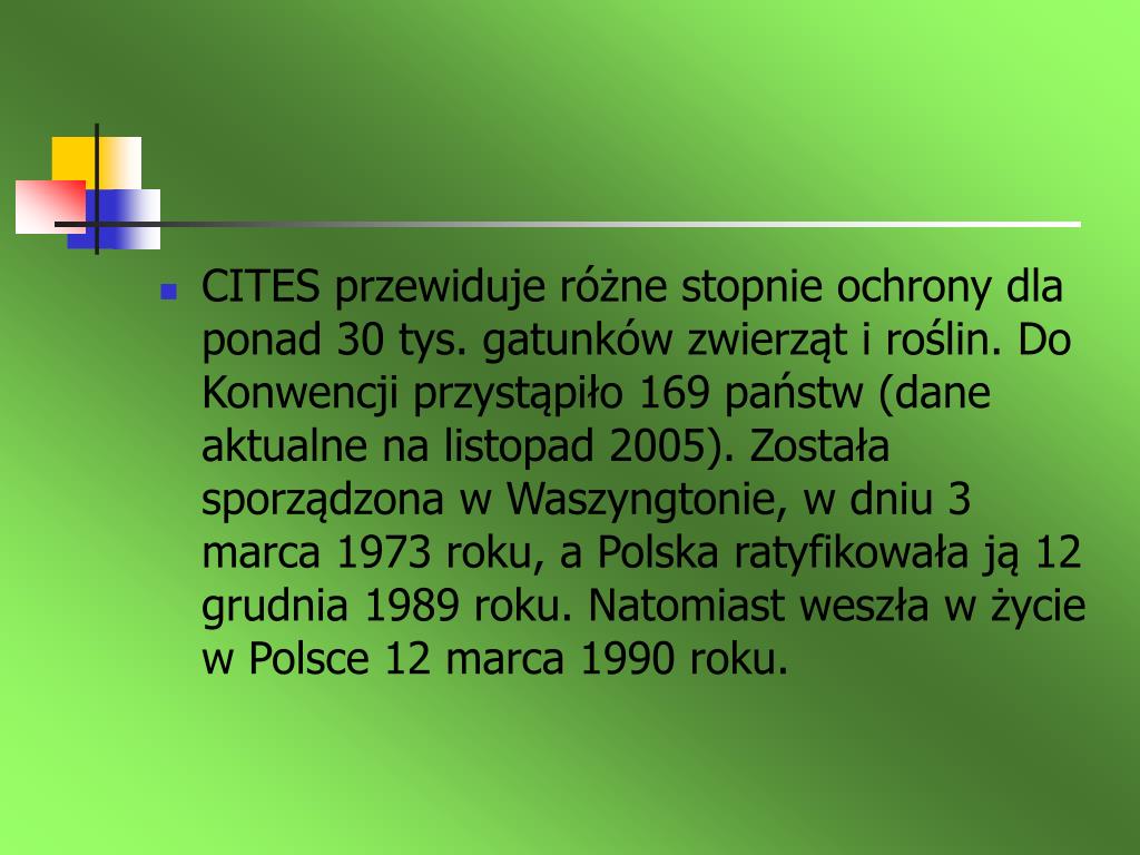 CITES przewiduje różne stopnie ochrony dla ponad 30 tys. gatunków zwierząt i roślin. Do Konwencji przystąpiło 169 państw (dane aktualne na listopad 2005). Została sporządzona w Waszyngtonie, w dniu 3 marca 1973 roku, a Polska ratyfikowała ją 12 grudnia 1989 roku. Natomiast weszła w życie w Polsce 12 marca 1990 roku.