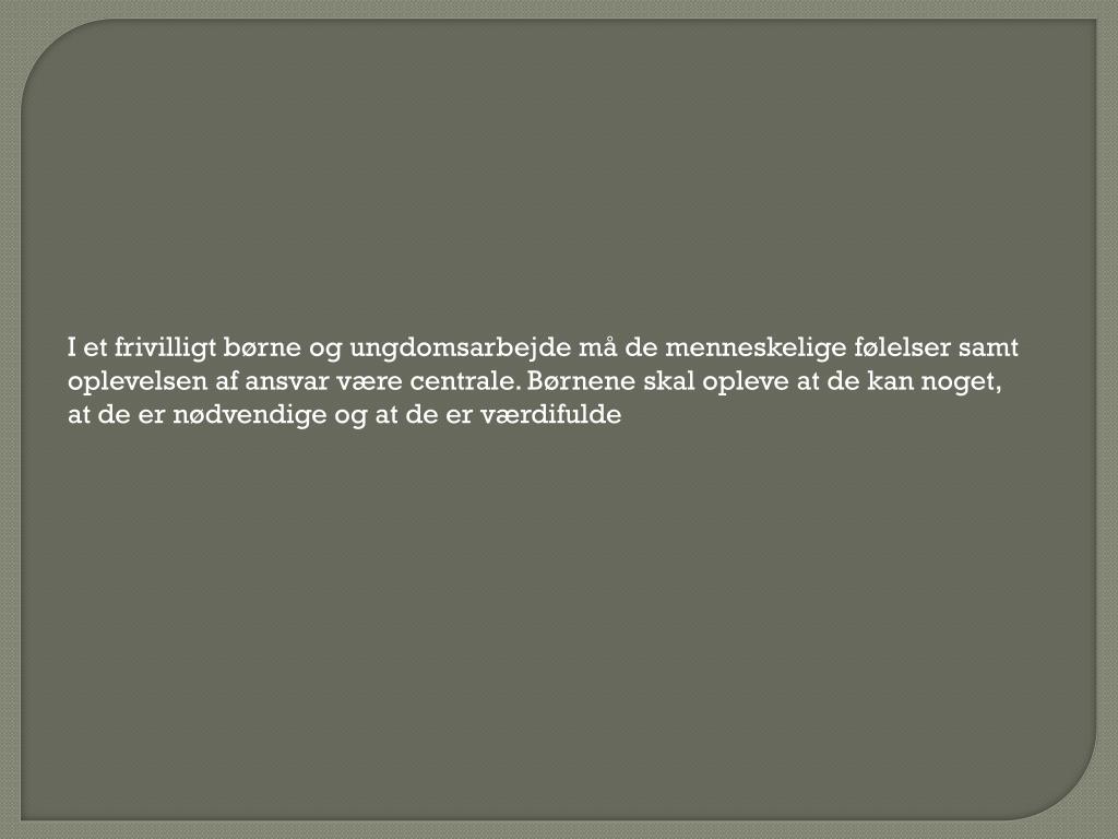I et frivilligt børne og ungdomsarbejde må de menneskelige følelser samt oplevelsen af ansvar være centrale. Børnene skal opleve at de kan noget, at de er nødvendige og at de er værdifulde