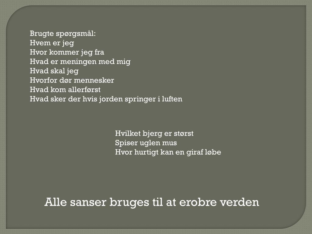 Brugte spørgsmål: Hvem er jeg Hvor kommer jeg fra Hvad er meningen med mig Hvad skal jeg Hvorfor dør mennesker Hvad kom allerførst Hvad sker der hvis jorden springer i luften Hvilket bjerg er størst Spiser uglen mus Hvor hurtigt kan en giraf løbe Alle sanser bruges til at erobre verden