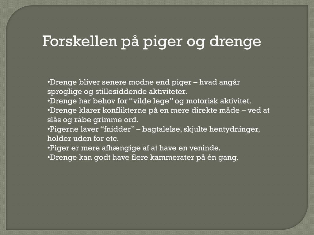 Forskellen på piger og drenge • Drenge bliver senere modne end piger – hvad angår sproglige og stillesiddende aktiviteter. • Drenge har behov for “vilde lege” og motorisk aktivitet. • Drenge klarer konflikterne på en mere direkte måde – ved at slås og råbe grimme ord. • Pigerne laver “fnidder” – bagtalelse, skjulte hentydninger, holder uden for etc. • Piger er mere afhængige af at have en veninde. • Drenge kan godt have flere kammerater på én gang.